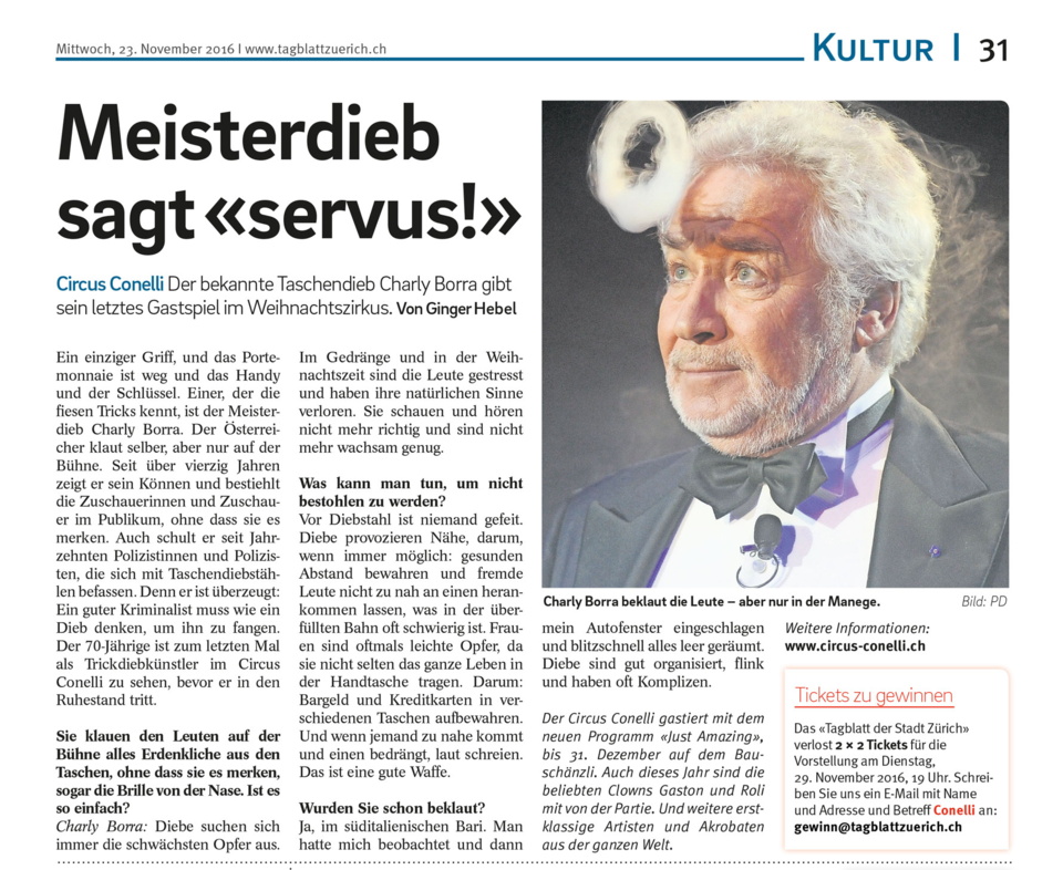 Der bekannte Taschendieb Charly Borra gibt sein letztes Gastspiel im Weihnachtszirkus Circus Conelli.