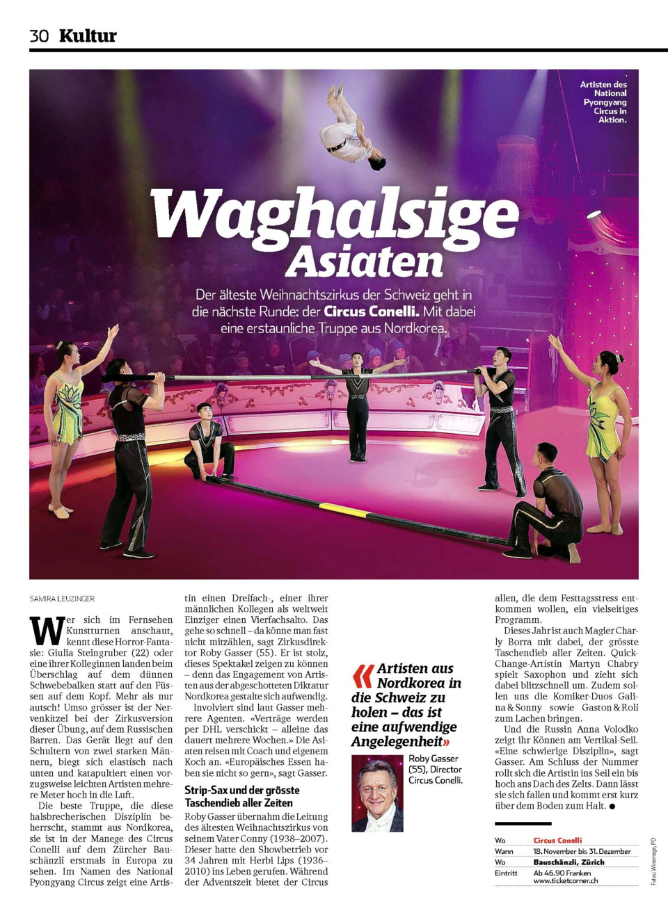 “ … Die beste Truppe, die diese halsbrecherischen Disziplin beherrscht, stammt aus Nordkorea, sie ist in der Manege des Circus Conelli auf dem Zürcher Bauschänzli erstmals in Europa zu sehen. Im Namen des National Pyongyang Circus zeigt eine Artistin einen Dreifach-, einer ihrer männlichen Kollegen als weltweit Einziger einen Vierfachsalto. Das gehe so schnell – da könne man fast nicht mitzählen, sagt Zirkusdirektor Roby Gasser (55). Er ist stolz, dieses Spektakel zeigen zu können – denn das Engagement von Artisten aus der abgeschotteten Diktatur Nordkorea gestalte sich aufwendig… „